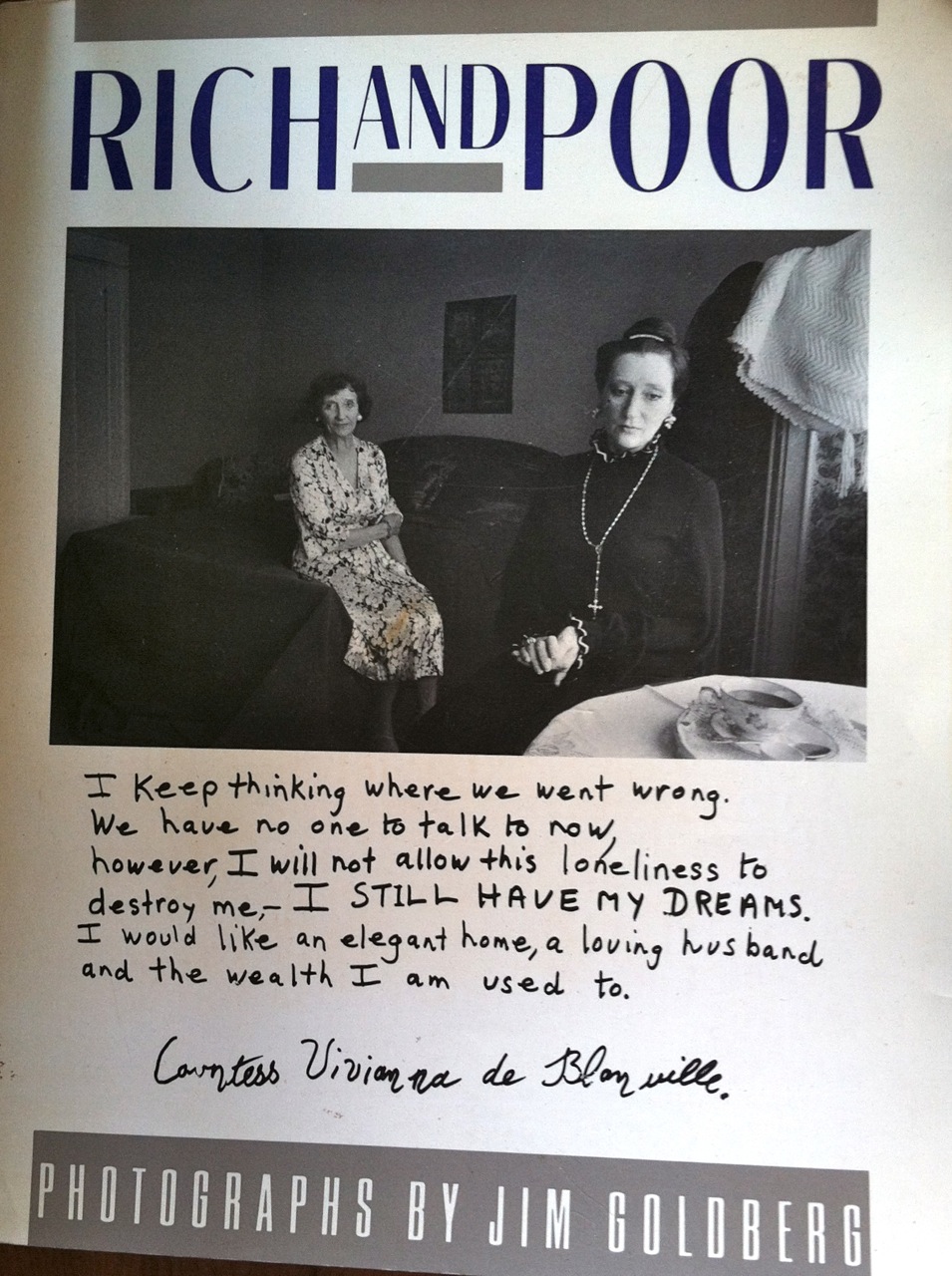 Let’s leave out the work of the smartest who also have to be the most athletic in order to get the most out of being a classically trained oil painter artist, because we all know that no one is interested in art, at least those with money care only about matching their mostly ugly decor, and they never get it right which is the decor along with their homes keep changing so long as the money doesn’t run out, and those without money are mostly homeless, and thinking about only surviving through to the next day; instead to focus on the world’s top fashion designers who decide they don’t want to miss the boat on the next best selling book, that will obsolete every book written since Adam Smith’s nonsense “Wealth of Nations” including your very interesting photojournalist Jim Goldberg’s